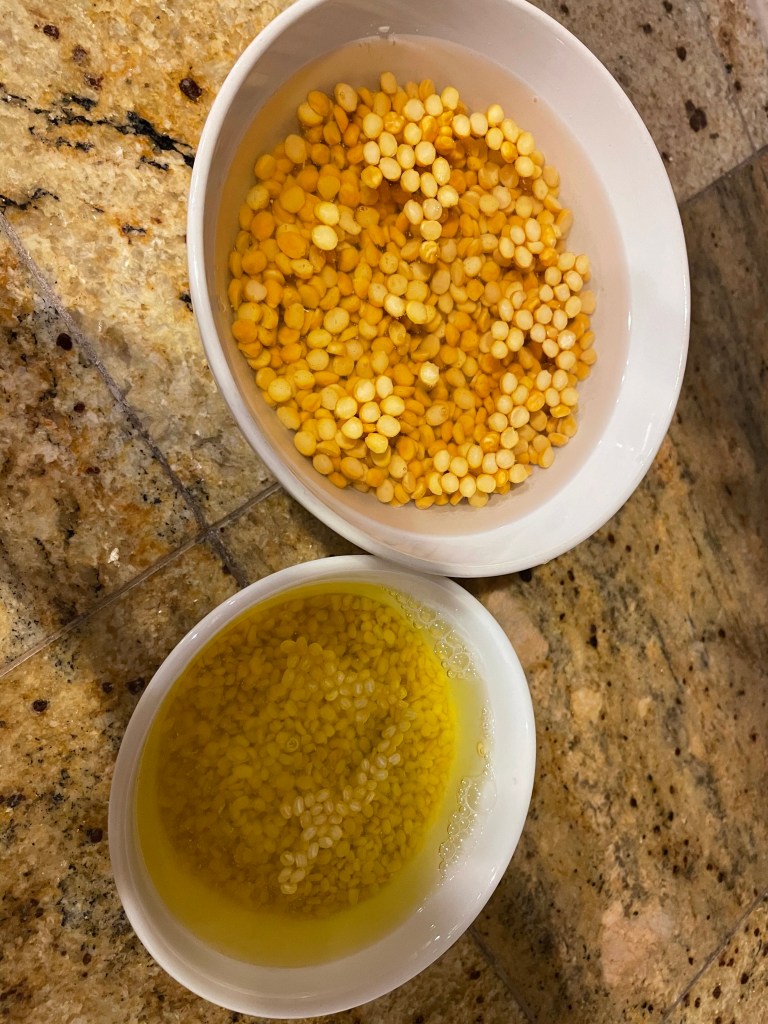 - Wash and soak Bengal gram (Chana Dal) overnight. Soak the Moong Dal the morning of the preparation.