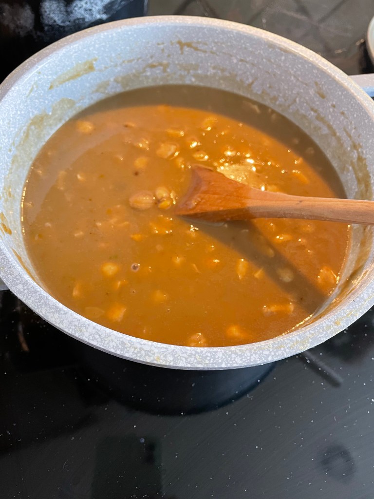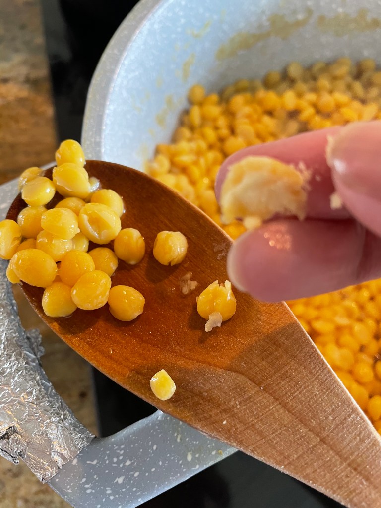 - Cook Bengal gram with just enough water on a low cook-top flame until it is soft but not mushy. Verify with your fingers that the gram breaks easy and is tender. (It took almost 45 minutes for my gram to cook evenly. You can pressure cook the Bengal gram just for 5 – 6 minutes on medium flame if you prefer.)