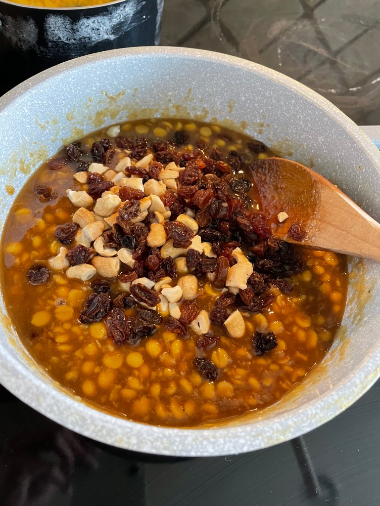 - Once the gram is cooked and easy to break with your fingers, add brown sugar, cashew nut bits, raisins and stir well.