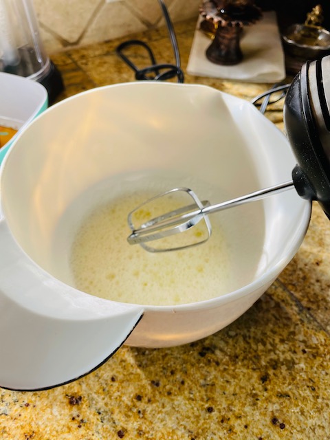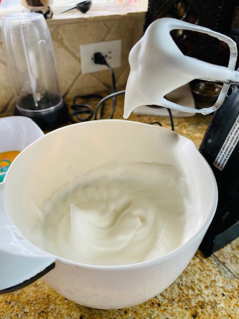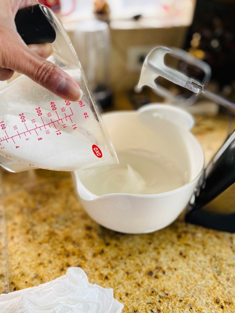 6. Gradually add the sugar, 1 tablespoon at a time, and whisk until thick and glossy.