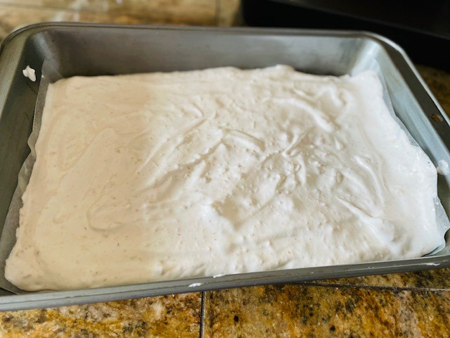 8. Spoon onto the baking tray and spread this egg mixture evenly inside the marked rectangle.