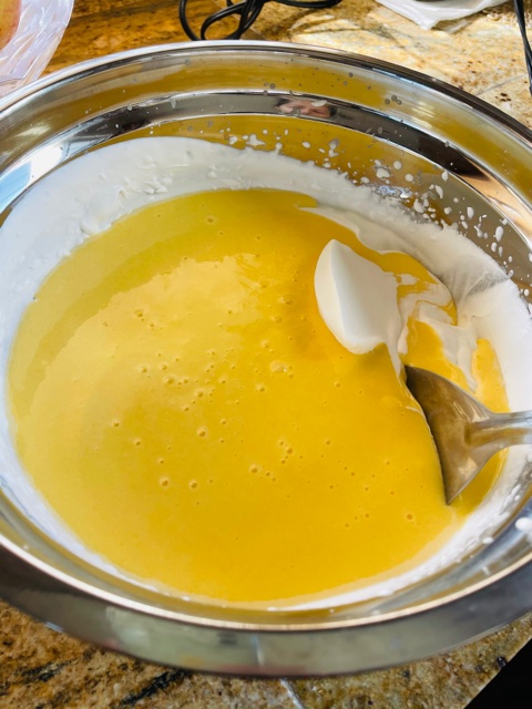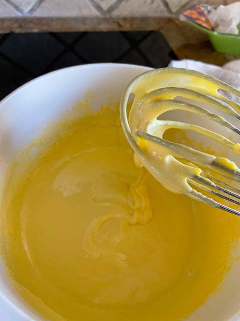 4. Remove the bowl from the heat and continue to whip the mix to help it cool. The mixture will have a thick consistency with a lemon yellow color. Keep aside and allow it to cool.