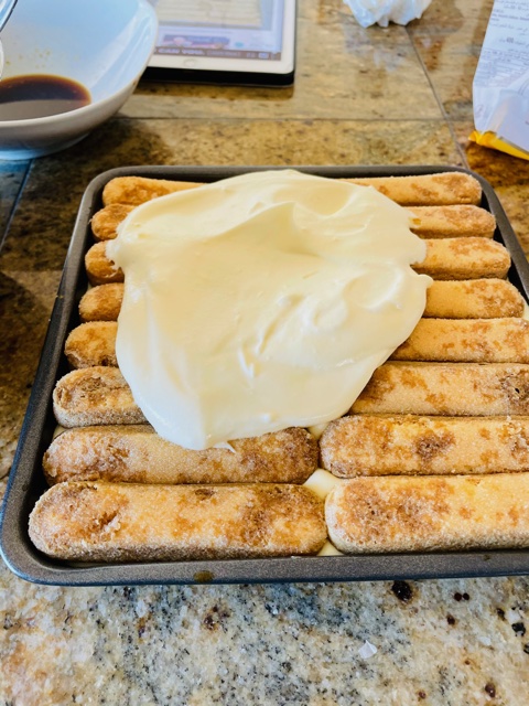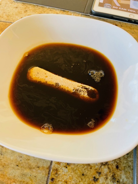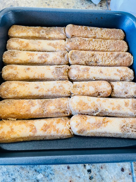 2. Dip the ladyfingers one at a time into cold expresso just long enough to get them wet – do not soak them!