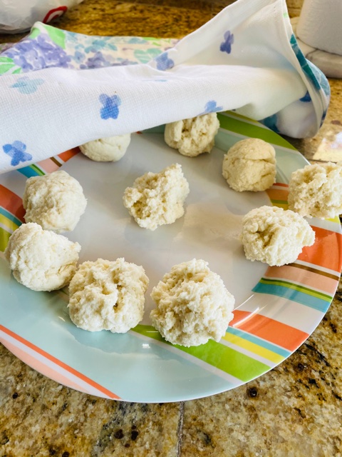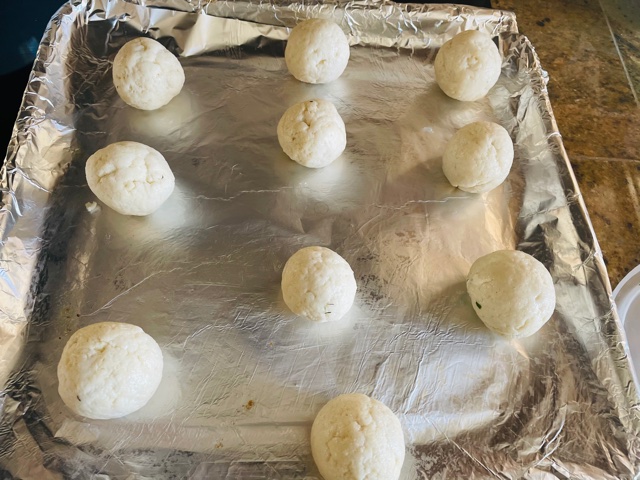 Place 1/2 tbsp cream cheese filling (you made earlier) inside each ball.